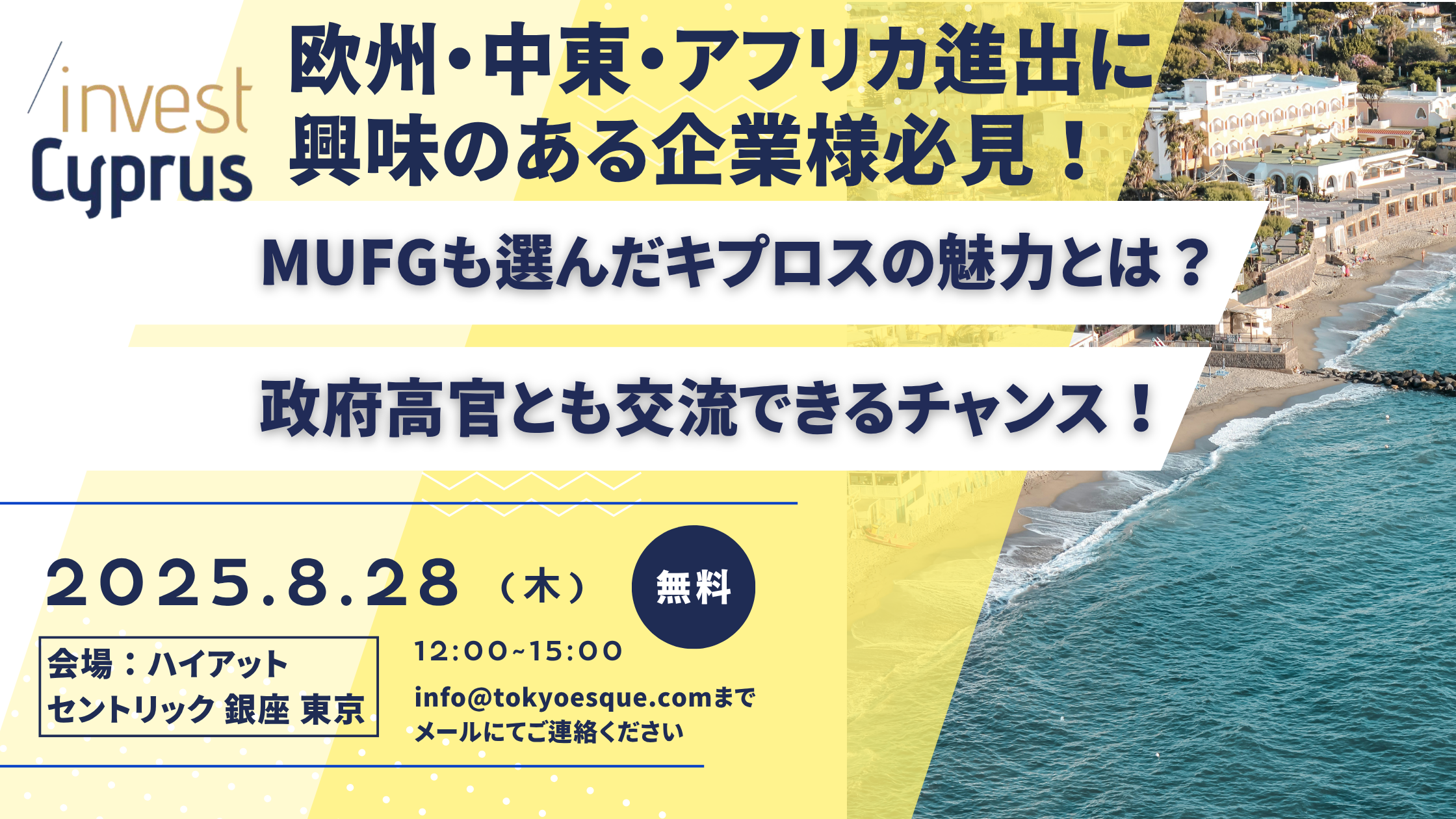 EU加盟国であり、欧州進出の起点としての「キプロス」の可能性を、現地担当者から直接聞ける貴重な機会です。