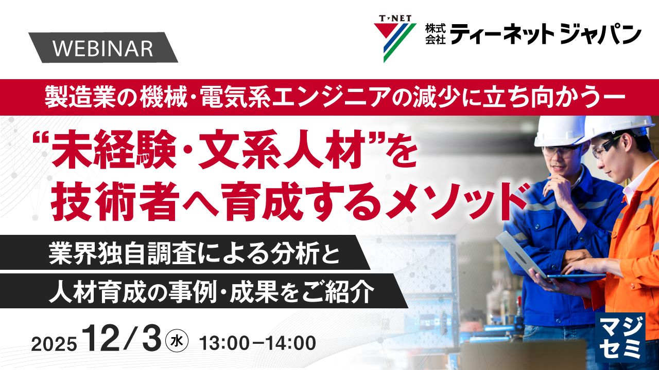 ティーネットジャパンでは、製造業における“未経験・文系人材”を技術者へ育成するメソッドに関するWebセミナーを、12月3日(水)に開催いたします。