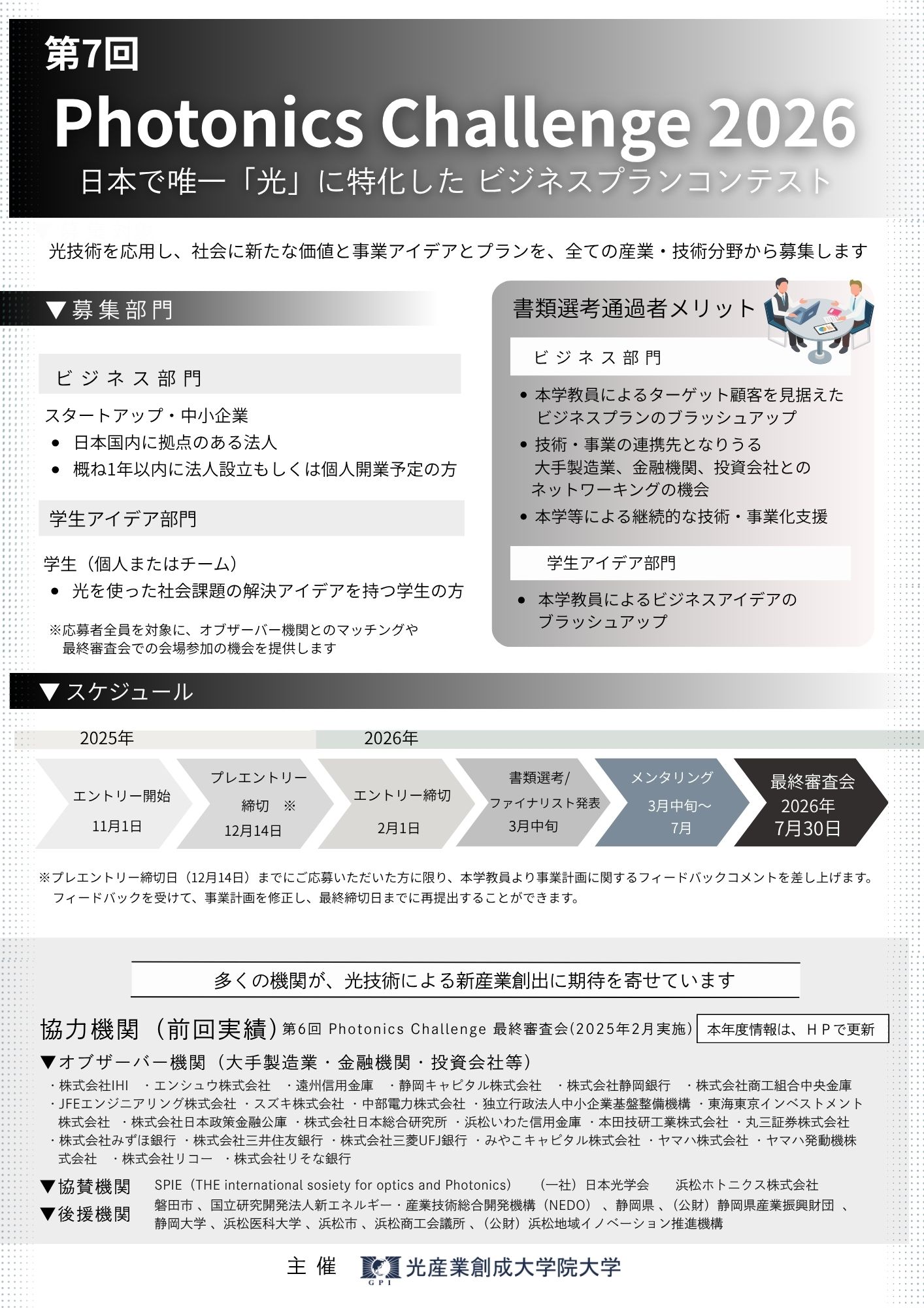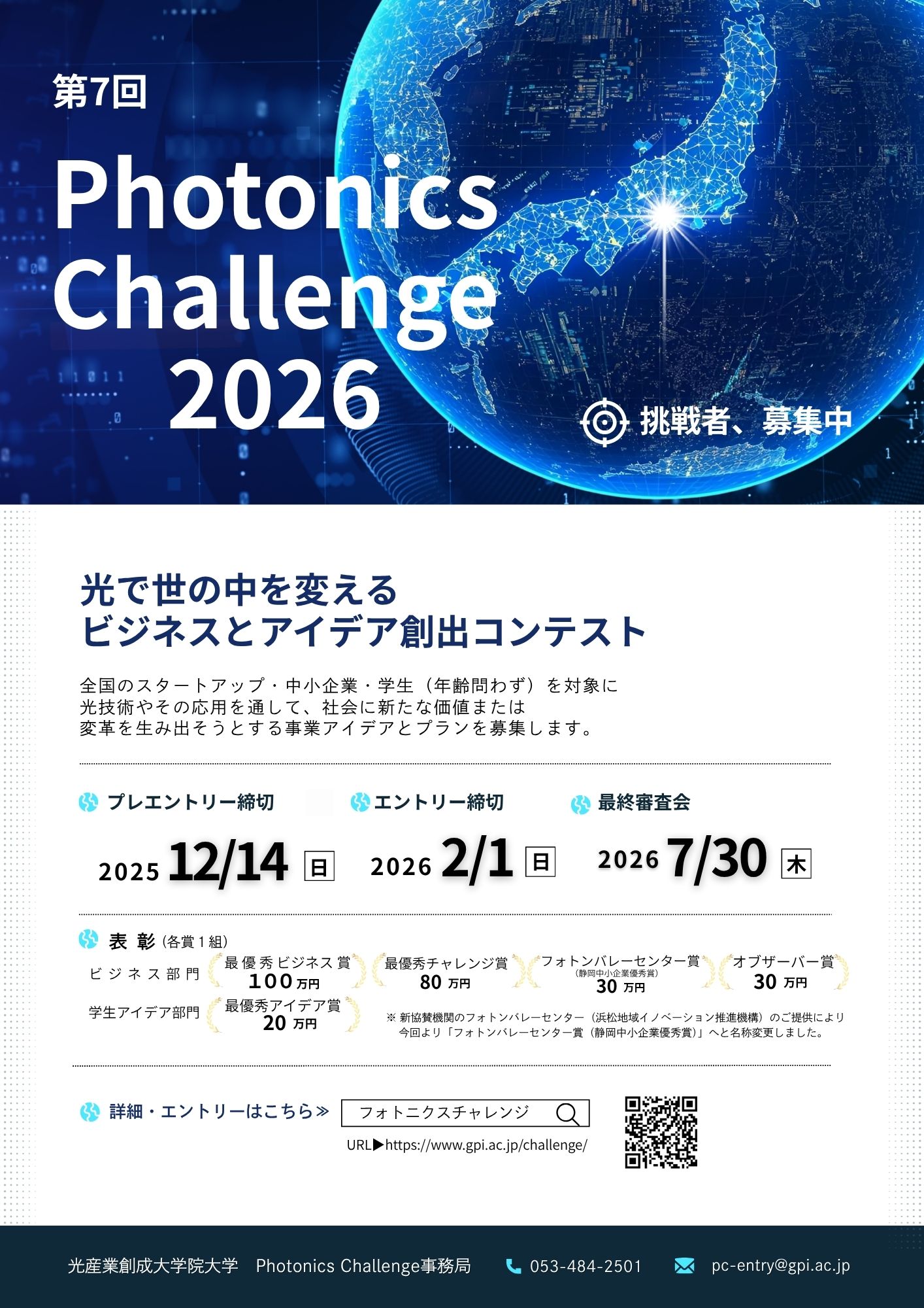 浜松市に拠点を置く光産業創成大学院大学では、光技術やその応用による革新的なビジネス創出に挑戦する意欲的な人材の発掘を目的に、ビジネスプランコンテスト「第7回 Photonics Challenge2026」を開催いたします。光技術を応用した事業アイデアやプランを、分野を問わず、全国から幅広く募集します。