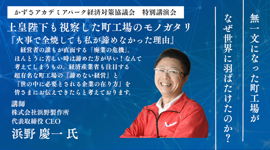 当日の講演会は、経済産業省の先進的なインキュベーションモデルとしても注目されている金属加工業(墨田区の町工場)である浜野製作所の浜野慶一様をお招きして「諦めない経営」「世の中に必要とされる企業の在り方」などをテーマにお話いただきます。