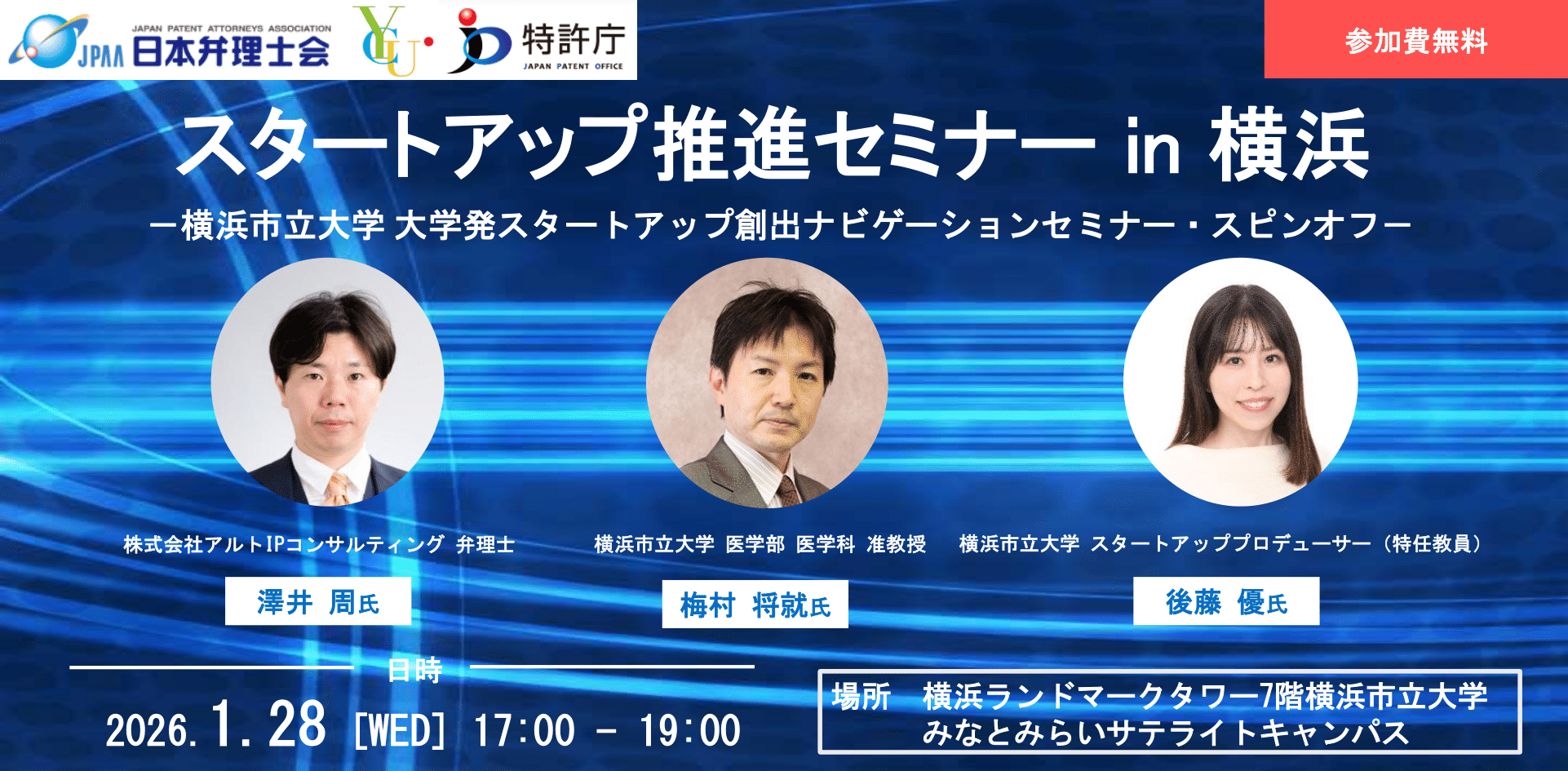 日本弁理士会関東会中小企業・スタートアップ支援委員会と、横浜市立大学の共催、特許庁スタートアップ支援班の後援で、「イベント名:スタートアップ推進セミナー in 横浜」を2026年1月28日(水)17時より、横浜ランドマークタワー7階 横浜市立大学みなとみらいサテライトキャンパス(横浜・みなとみらい)にて開催します。