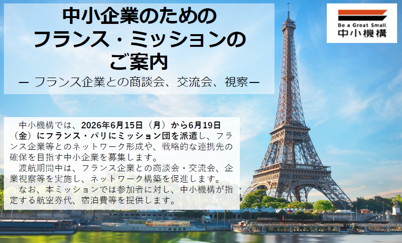 中小機構では、2026年6月15日(月)から6月19日(金)にフランス・パリにミッション団を派遣し、フランス企業等とのネットワーク形成や、戦略的な連携先の確保を目指す中小企業を募集します。